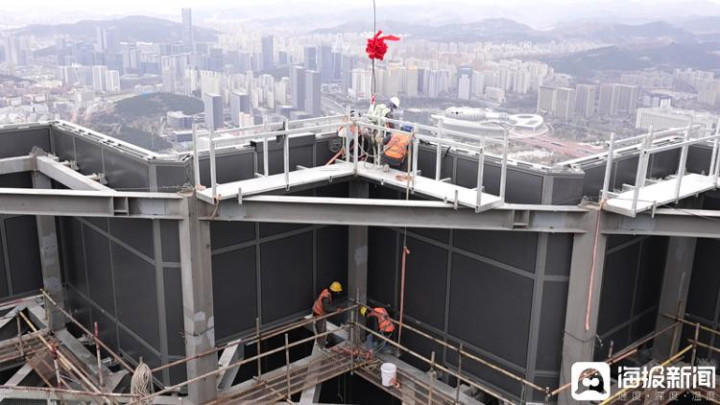 12月12日上昼,终末一块幕墙单位体告成吊装完成,428米高的绿地山东外洋金融中心(IFC)厚爱完成塔冠幕墙封顶。