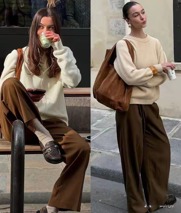 在这阴寒的冬季,如实合适穿低充足度的衣服,表情不错用浅黄色、杏色,或者是径直用白色的毛衣来搭配上驼色的直筒阔腿裤,脚穿一对乐福鞋就够。
