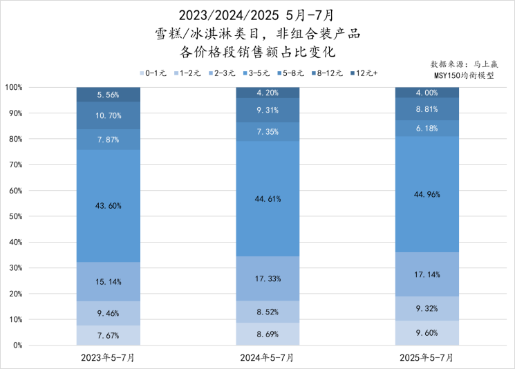 况兼从2023—2025年每年5—7月的监测数据来看,0—1元价钱带的销售额占比在逐年飞腾;2—3元和3—5元价钱带是最主流接管,销售额占比一直牢固;而8—12元及12元+价钱带销售额占比则在握续消弱。