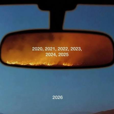 2025年走到尾声时,一张图在互联网上被反复转发。画面里,一辆车正行驶在公路上,后视镜里,2020至2025的篇章如一派放手的荒漠,火光照射着全球性的暂停、重启与无数个体的茫乎。当咱们终于将见地转上前线,2026的说念路在晨光中张开。